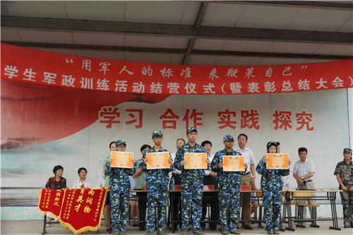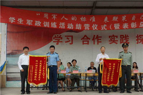 在结营式中,祁学银宣布了军训表彰决定。24个先进集体、169名优秀学员获得表彰。陈成澍和祁学银代表学校向军训基地、承训部队分别赠送锦旗,向在军训中付出辛勤劳动与汗水的全体教官、随训教师和工作人员表达了敬意。