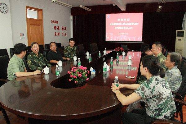 8月24日上午,上海武警总队孟云灿副参谋长带队,来我院视察调研军训工作。院长李永盛、党委书记祁学银、副院长姚健敏陪同调研。 军训团团长徐晓建向首长汇报了我校军训开展情况,李永盛校长向孟云灿副参谋长表示感谢,感谢上海武警总队第七支队共计48名教官在酷暑来校为新生开展为期10天的军事训练,希望军民融合,继续共建。祁学银书记肯定了教官们的工作,认为这支部队作风严谨,训练有素。孟云灿副参谋长向军训团提出要求,希望他们重视此次工作,圆满完成各项训练任务,以优异成绩向学校汇报。