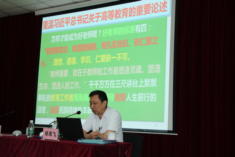 胡展飞副院长布置新学期教学工作,从“重温习近平总书记关于高等教育的重要论述”“国兴而贵师,打造全员全程全方位育人平台”“构建质量保证体系,大力提升人才培养质量”三个部分深刻阐述了如何加强教育教学理念。