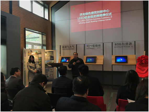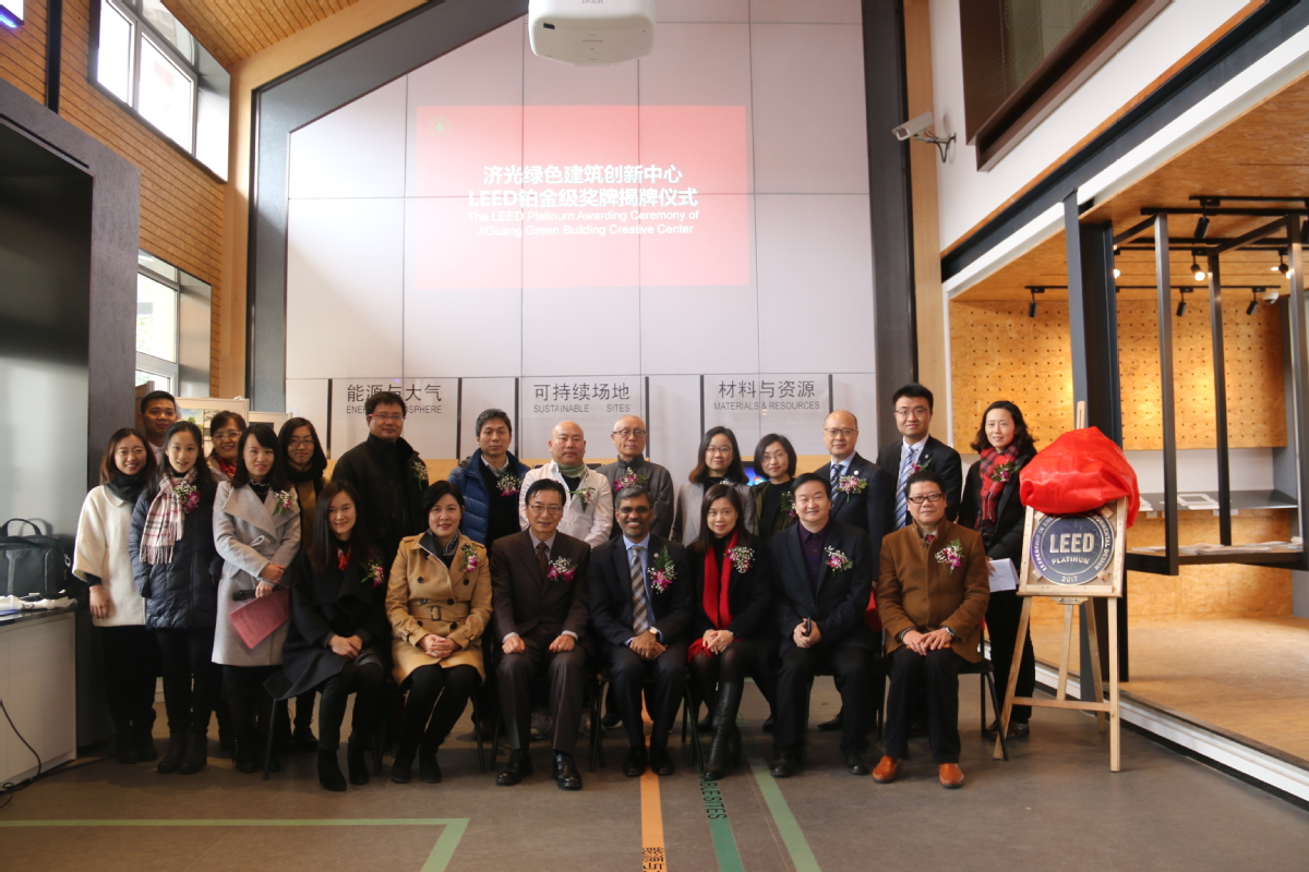 我院校企共建的济光绿色建筑创新中心于2017年9月获得美国绿色建筑委员会(USGBC)授予的LEED 铂金级认证并于2018年1月17日上午在我院绿色建筑创新中心举行了LEED铂金奖牌揭牌仪式。美国绿色建筑委员会(USGBC & GBCI)总裁兼首席执行官Mahesh Ramanujam先生、美国绿色建筑委员会(USGBC & GBCI)北亚区董事及总经理杜日生先生、中国建筑节能协会副理事长及上海市建科院总工程师徐强先生、中国网频道总监徐洲先生等专家出席了揭牌仪式。学院院长李永盛到会致辞,专家们充分肯定了我院践行国家绿色发展理念、服务生态文明建设所进行的教育教学改革创新。本次揭牌仪式将为我院国际化绿色建筑产、教、研创新基地建设开启新的篇章。