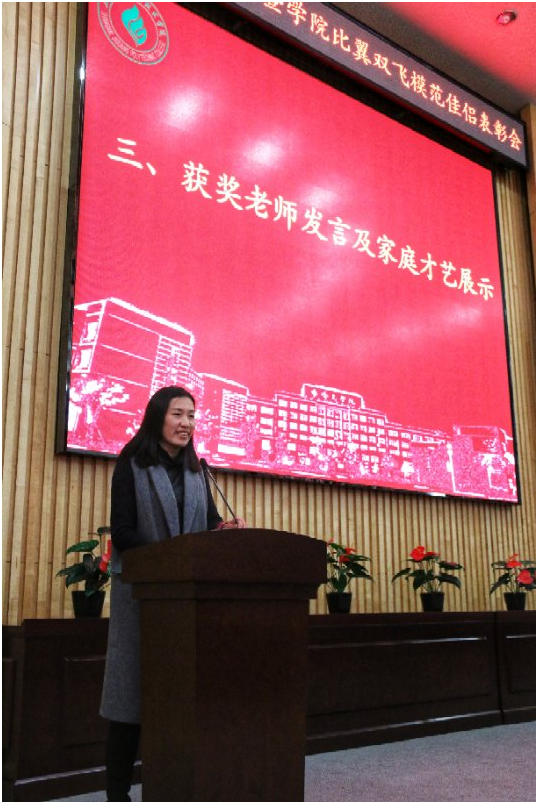 李永盛院长首先代表学院党政班子向学院女教工致以节日的祝贺和诚挚的祝福。随后,学院为评选出的比翼双飞模范佳侣进行了表彰,获奖家庭分别为学生处王琛家庭、基础部刘冬燕家庭,学院领导颁发奖状。随后,获奖家庭围绕“巾帼新作为、绽放新时代”作了获奖感言并进行家庭才艺展示,她们热爱工作、热爱生活,积极向上的精神,使到会女教工深受感动、共同分享喜悦。会后工会组织女教工统一观看电影,并送上节日“大礼包”表示庆贺。