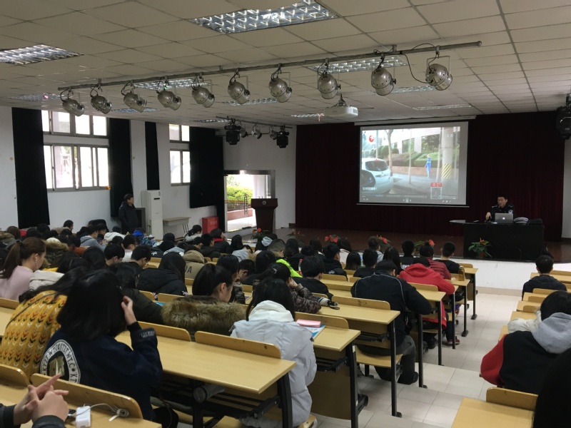 讲座伊始,葛警官由“影响安全行驶的客观因素”入题,通过一系列图片演示,向同学们分析展示了影响安全出行的各种不利因素,同时穿插多个交通视频录像,形象生动地说明了安全出行对于同学们的重要性。展示视频里的几个交通事故实拍更是带给同学们最为直观的震撼,提醒在座的同学们回顾自己是否曾存在过如此这般诸多的不良出行习惯。