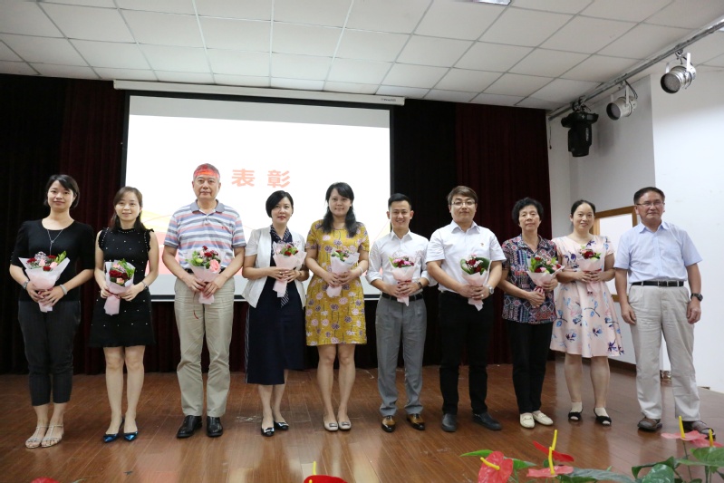 组织部长、人事处长叶新宣读2017-2018年度所获市教委、市级及以上奖励的人员名单,学院2017-2018年度“优秀教师”、“优秀辅导员”、“先进教育工作者”人员名单,以及学院2017-2018年度“优秀共产党员”、“优秀党务工作者”、“优秀党支部”名单,院领导及院系部负责人为获奖教职工颁发荣誉证书及献花。