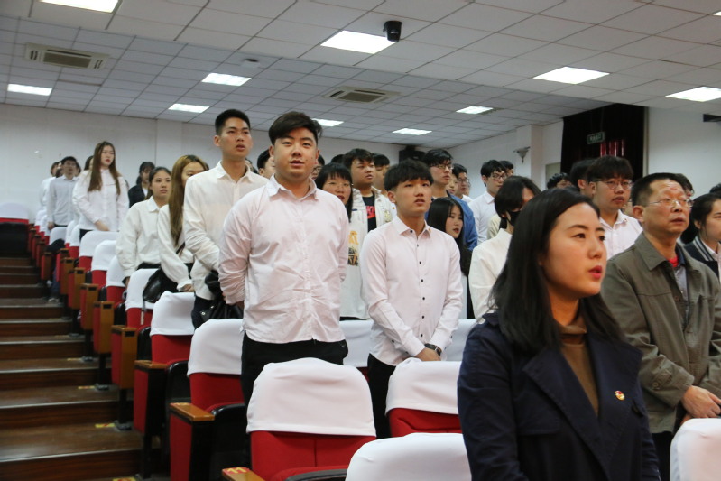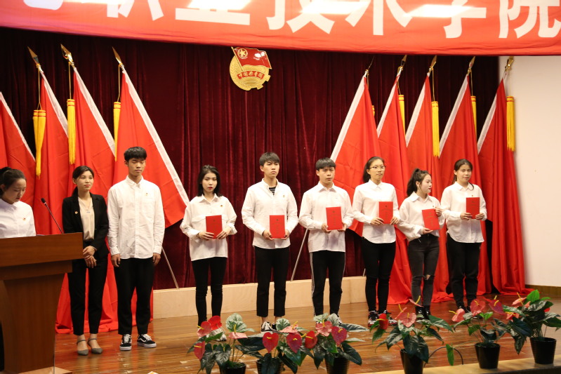 新团员代表在大会师生的见证下庄严宣誓、光荣地加入中国共产主义青年团、院党委书记姜富明为新团员颁发团员证以及团徽。