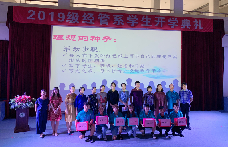 随后,播种“理想的种子”仪式启动,这也是经管系新生入学教育中已传承三年的经典活动。活动中,胡春宝老师首先引导同学们要规划大学生活,设定目前可实现的目标,以达到理想;其次,让同学们自己立下三个小目标,争取在大学三年中完成。最后,每位同学按专业、班级列队上台,将自己的理想卡片投入到各自专业的“种子箱”,并由专业派出一名新生代表对种子箱进行封存,等到三年后毕业时再开启,并在全系新生同学和老师面前立下誓言。这样有仪式感的安排是为了促使同学们建立有追求目标的庄严感和神圣感,从而以自己的行动去努力追求。播种+耕耘=收获是一个永恒不变的等式,只要我们心中有所期盼,有所希望,并为之不懈努力,勤奋拼搏,收获的脚步一定会向前迈进。