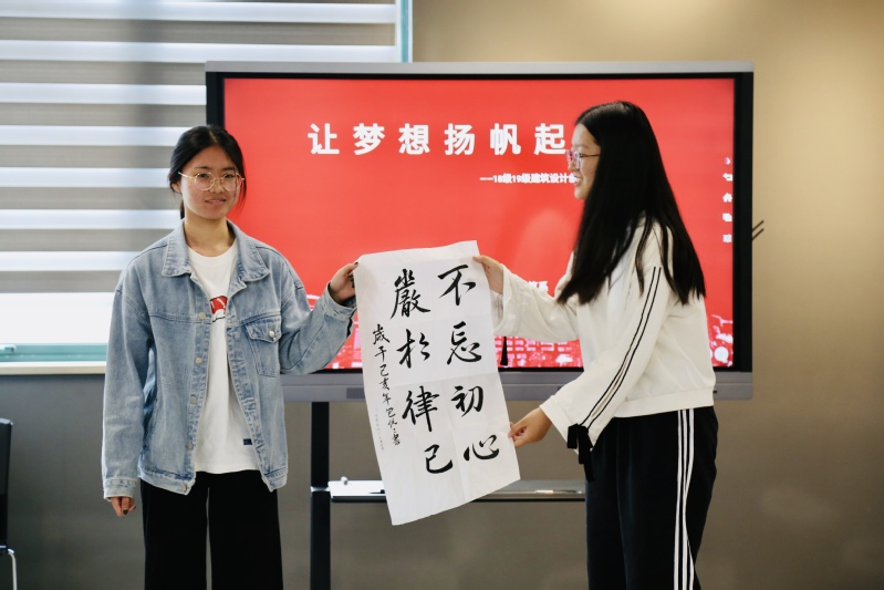 2018级中捷创新班的学生代表彭思远进行了2019布拉格暑期workshop游学汇报,展现了在布拉格为期20天的学习交流成果;2018级建筑创新班班长黄沈乐同学向学弟学妹们分享了18创新班在过去一年中获得的成果。随后,2019级中捷创新班班长丁莹上台发言,她表示对未来的学习生活充满信心,将会明确学习目标,努力拼搏进取。与会教师们也纷纷对同学们的学习生活提出了要求和期望。分享会的最后,2018级中捷班学长学姐赠送了“不忘初心,严于律己”的书法作品给2019级的学弟学妹们并合影留念。