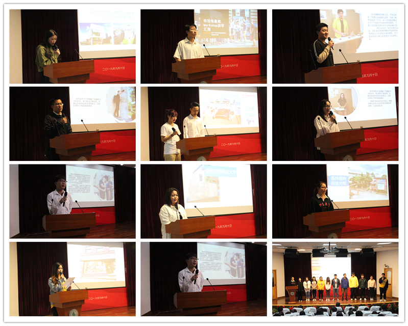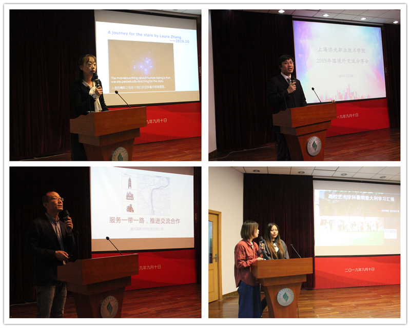 在师生们学生交流部分,建筑系蒲仪军老师分享了其赴捷克布拉格的情况,基础部英语教研室张丹丹老师全英文分享了在新西兰奥克兰大学硕士进修项目交流的学习经历,艺术设计系梁冬妮和吴艺韫老师共同分享了前往意大利游学收获;建工系吴佳敏同学详细阐述了参加英国哈德斯菲尔德大学与牛津大学院校联合夏令营的收获,经管系与艺术设计系学生代表分别分享了在在德明财经科技大学聆听的《吸引力法则》、《台湾文创面面观》等专题讲座以及参观故宫博物院和国父纪念馆的学习经历,护理学院学生代表分享了前往英国中央兰开夏大学的学习成果,经管系国际邮轮乘务管理专业14位同学分享了在登上MSC地中海“辉煌号”国际邮轮上的收获,建筑系学生代表详细阐述了参加布拉格建筑学院暑期工作营期间的所学所想,学生们感受到全方位的文化教育体验;经管系林俊老师作为带队教师代表分享了近年来参与过的国境外交流项目并对学校表达感谢。
