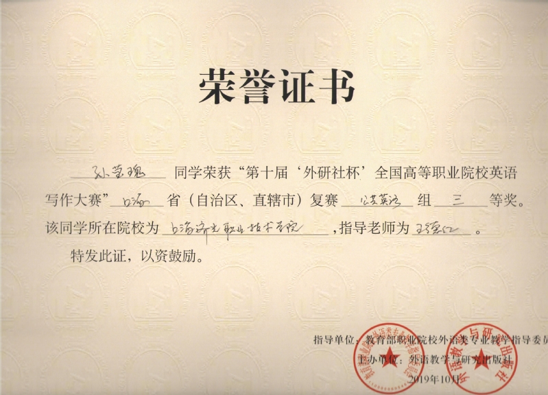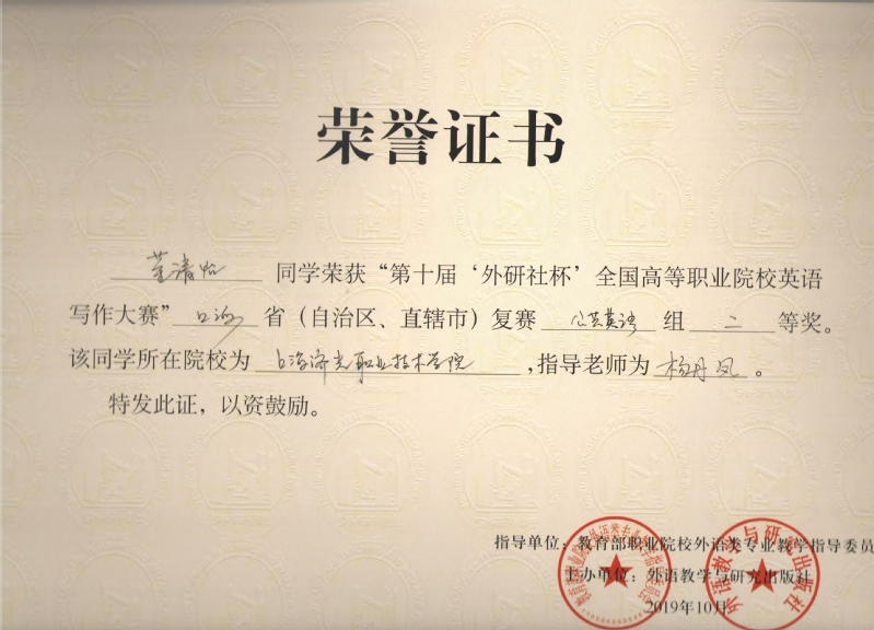 自2019年5月两名同学在校内初赛中胜出后,在基础部领导和外语教研室的支持和鼓励下,由杨丹凤老师、王德红老师在业余时间分别负责辅导这两名学生,经过几个月的共同努力,最终取得了好成绩,展现了我院学生的外语水平,为我院增光添彩。