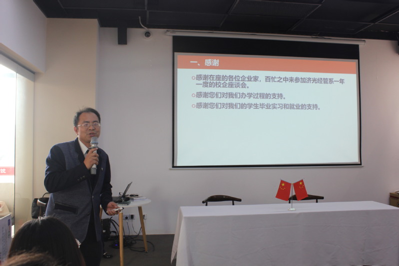经管系主任张迺英教授首先致辞并介绍了学院2019年的发展情况及工作成果,对合作企业给予学院和经管系的大力支持和帮助表示感谢,她同时希望校企合作模式不断创新,合作关系更亲密、合作形式更丰富、合作内容更广泛,校企双方共育人才、共享资源、合作共赢,为各行各业培养更多、更优秀的技术技能型人才。