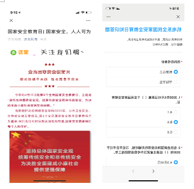 机电系于4月10日至4月15日组织全体19级学生通过“安全知识教育进课堂”进行网上学习、参加安全教育考试,并通过机电系微信公众号发布“国家安全,人人可为”专题宣传,在线上发起“国家安全知识小测试”互动活动。机电系师生积极参加,彰显爱国主义、红色品格、科学精神、集体主义,形成良好的舆论氛围。