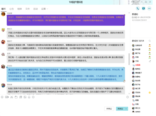 护理学院分团委、学生会组织各班班长和组织委员召开关于国家安全主题活动的部署落实会议,明确了本次活动的重要意义、活动主题和组织形式。4月11日-4月15日护理学院22个班级积极响应充分利用腾讯会议、微信、QQ的平台围绕“维护国家安全,共建和谐社会”进行线上讨论。为全面贯彻落实党的十九大精神和习近平总书记总体国家安全观战略思想,进一步增强学生国家安全意识,自觉从自身做起,护理学院也组织开展了“全民国家安全教育日”主题手抄报创意活动。