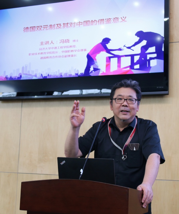 开班仪式结束后,同济大学中德工程学院院长冯晓教授作《德国双元制及其对中国的借鉴意义》首场报告,详细介绍了德国职业教育的发展历程、德国“双元制”的基本特点和德国经验的简介一一以及对发展中国职业教育的建议,对于我院高职教育改革和研究有很大启发意义。