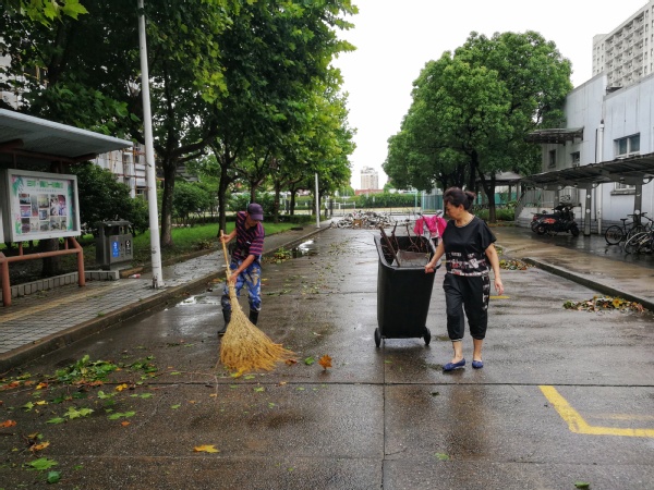 后保处组织维修科和物业人员对校园进行全面巡查清理,奋力抢修加固避免了设备受损,并对校园各处进行树枝清理和道路清扫。