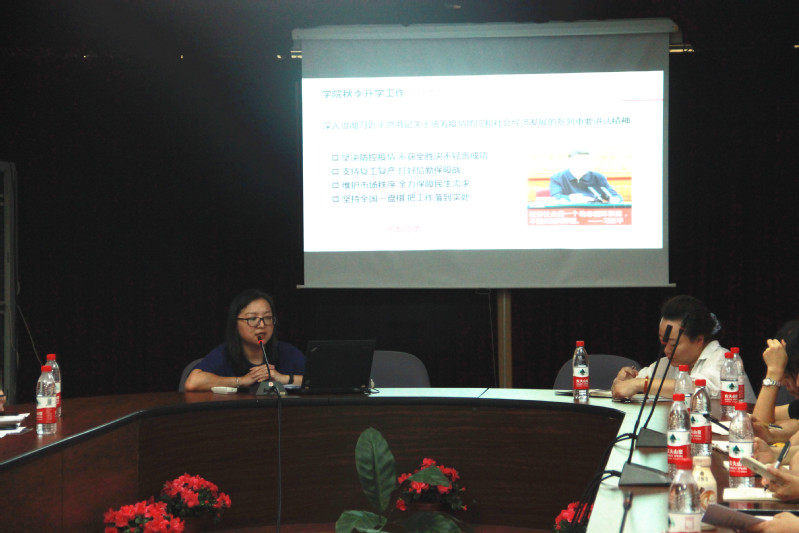 会上,党委副书记刘丽从学院秋季开学工作方案、疫情期间辅导员工作职责和本学期需要重点做好的工作三个方面对学院秋季开学疫情防控工作进行了统一部署。并现场解答了辅导员最关心的十八个问题,对学院返校前的准备工作、学生返校当日报到流程、返校后学生日常管理工作以及学生突发疾病时的处置工作流程做了详细的安排。
