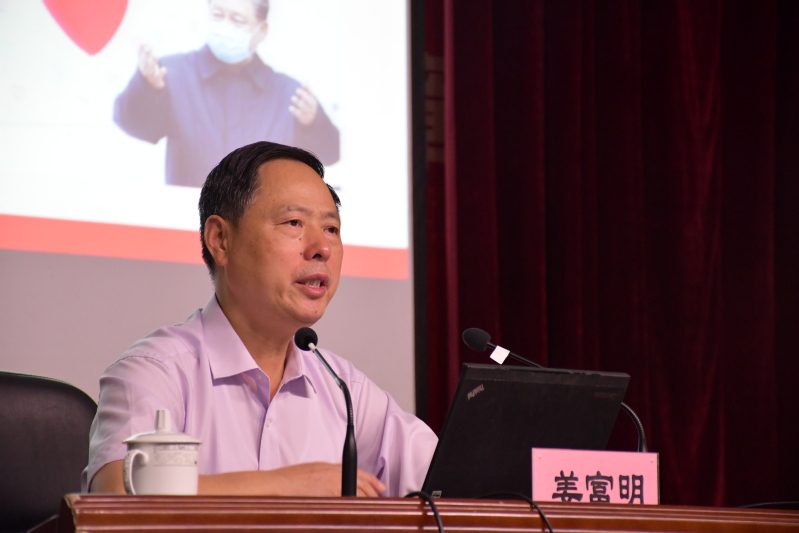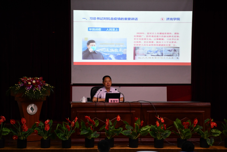 “面临突如其来的疫情,济光校友义无反顾、挺身而出,随着医疗大军,驰援武汉,不畏艰险、抗击病魔,夜以继日、无私奉献,成为‘最美逆行者’和‘生命摆渡人’,体现济光学子大爱情怀和责任担当。”姜富明书记结合我院师生校友或奔赴基层奉献青春,或践行服务锻炼意志,或勇敢逆行救死扶伤的生动案例,赞扬济光师生员工甘于奉献,自觉把国家利益、集体利益放在首位,人人担当负责,个个尽心尽力,号召学生们要以师生们的优秀事迹为鞭策,胸怀仁爱之心,践行互助之义,济人济困,解人之优,守望相助,共克时艰,聚力前行。