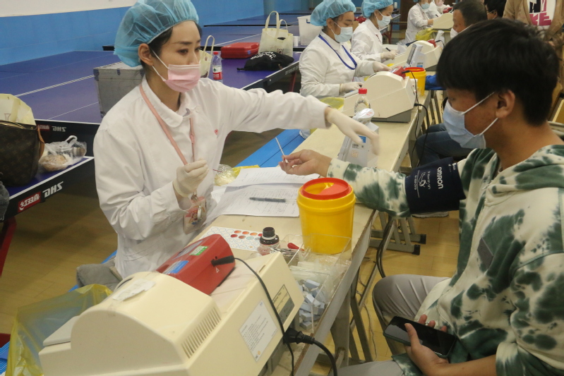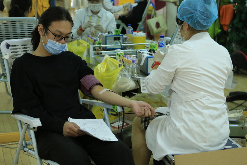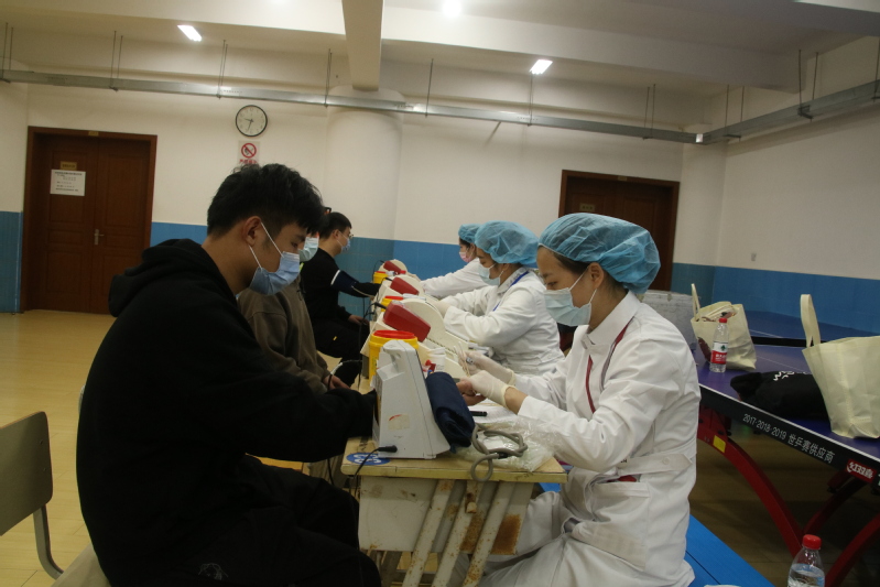 活动开始前,各院系以宣传海报、公众号、献血知识ppt等形式对无偿献血进行宣教,组织学生预报名、献血条件筛查。献血当天一早,我院党委书记姜富明、副院长王云飞、各院系负责人以及辅导员来到现场查看教职工和学生献血情况,为献血师生们带去关切的慰问和叮嘱。冬日渐凉,却抵挡不住师生们献血的热情。一大早在体育馆内广大师生陆续排起了长队,填写信息登记表,化验血液类型,再进行静脉采血,一步步紧张有序地进行。一袋袋满载爱与奉献的热血从手臂缓缓流向储血袋,师生们勇敢地撸起袖子、克服恐惧,用行动诠释爱的力量、传递人间温暖。志愿者们提前来到场地精心准备好茶点、水果等食物帮助献血者及时补充能量,恢复体力等,让参与献血的师生感受到浓浓的温暖。