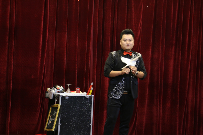 演出由“黑莓+”弦乐四重奏带来的名曲联奏拉开了整场演出的序幕;军旅歌唱家王瑞学老师男声独唱了《年轻的朋友来相会》和《祝酒歌》将舞台气氛推向了高潮;特型演员潘龙弟老师带来了精彩绝伦的口技表演,不仅模仿海陆空三军作战时的场面,还运用自己的专业口技带领现场的师生们重温毛主席在开国大典上的讲话;随后,独角戏、萨克斯、二胡演奏纷纷登场,带来了精彩纷呈的演出;变幻莫测的魔术表演引来台下的师生们掌声连连,欢呼不断;演出在朱震芳老师表演的京剧《梨花颂》中画上尾声。
