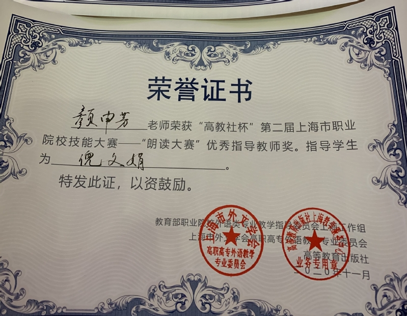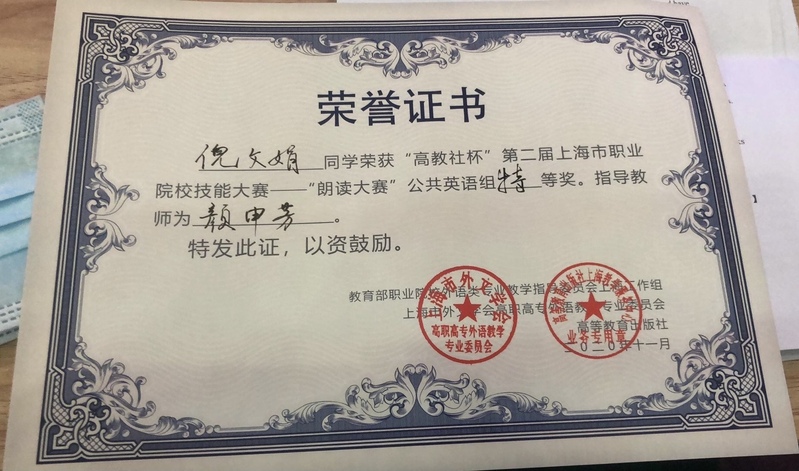 努力终有回报。倪文娟同学以总分92.22的高分在决赛中战胜其他强劲对手,获得了此次朗读比赛的特等奖,展现了我校学子的风采,为学院争得了荣誉。颜申芳老师获得本次比赛优秀指导老师奖。