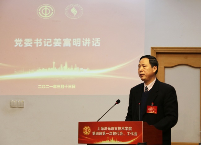 党委书记姜富明传达了学院党政班子对工会工作的重视和关心,肯定了会议报告的内容,祝贺新当选的新一届工会委员、经审委员和女职工委员。他指出,学院正处于高质量发展与启动“十四五”发展规范关键时期,希望广大教职工勇当先锋、无私奉献的精神,发展任务越是艰巨更需要我们广大教职工主动担当、积极作为。为加快推进高职教育现代化、推动学院各项事业高质量发展,为上海总体实现教育现代化作出应有的贡献。他强调,新一届工会要坚持把政治建设摆在首位,牢牢把握工会工作的正确政治方向,坚持围绕中心服务大局,发挥工会组织特点优势,在推进学院教育教育发展中彰显工会作用。