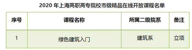 沪教委高【2021】6号、8号文《上海市教育委员会关于公布2020年度上海高职高专院校市级精品在线开放课程立项和培育名单的通知》《上海市教育委员会关于公布2020年度上海高职高专院校市级教师教学创新团队立项和培育名单的通知》,公布了2020年全市共有42个团队、35门课程获得立项建设。其中我校有2个团队和1门课程获得立项,分别是“建筑设计专业群绿色建筑教学创新团队”、“以文创为引领的艺术教学创新团队”、《绿色建筑入门》精品在线开放课程。截止目前,我校共有10个市级教学(教师教学创新)团队、14个市级精品(在线开放)课程。