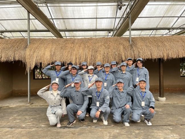 考察活动第二站社员们前往奉贤区的都市菜园感受生态文明之美,该基地是上海市科普教育基地。在基地里,社员们穿上红军服,体验红军生活。大家在阳光下站军姿、列队形,踏寻红色经典,磨练军事意志,增强团队凝聚力。来到稻草屋内,社员们通过一双双巧手剪出以今年建党100周年为主题的剪纸画。