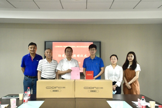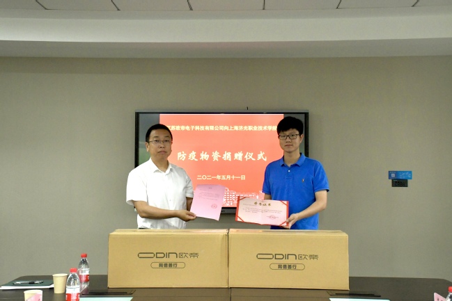为支持我校做好疫情防控常态化工作,2021年5月11日下午,江苏欧帝电子科技有限公司章再军总监代表公司向我校捐赠防疫物质,王云飞副院长及后勤保卫处相关人员出席捐赠仪式。