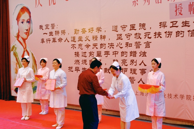 活动还特别邀请了上海交通大学医学院附属国际和平妇幼保健院护理部主任、主任护师李红,同济大学附属第十人民医院护理部主任、主任护师朱晓萍,上海交通大学医学院附属瑞金医院护理部主任、副主任护师朱唯一出席,并与护理学院教师姚淳、黄玉婷、陈斐、姜俞英、刘珊珊、归航、常晓晓、张倩、贾锡云一起为19级共569名全体护理同学进行授帽。