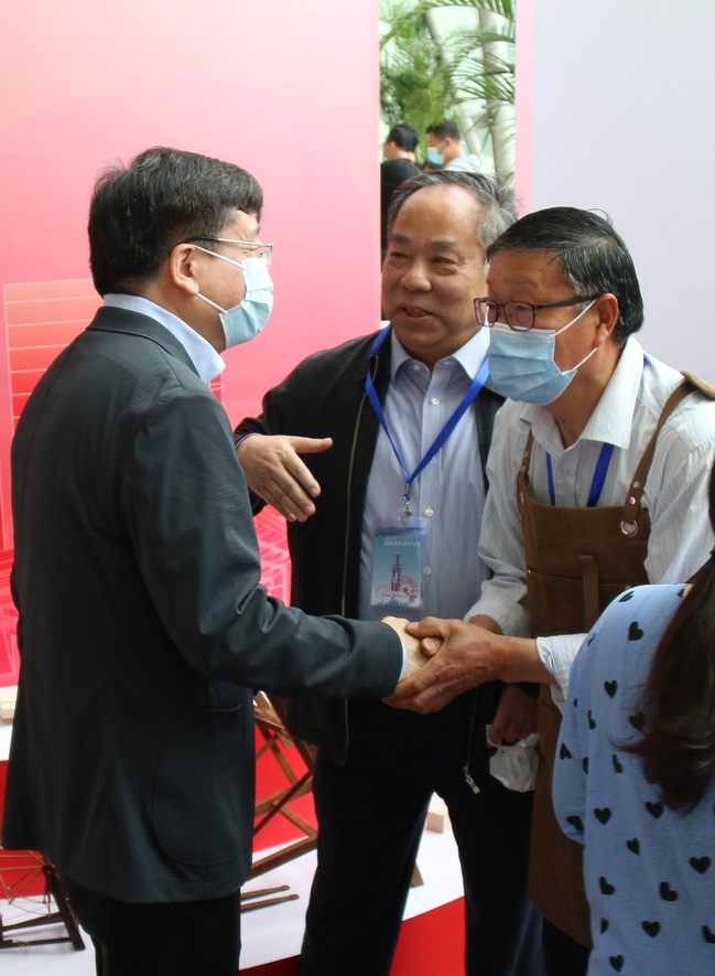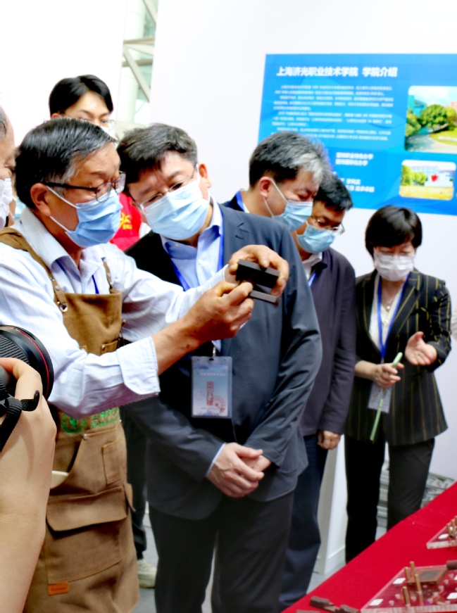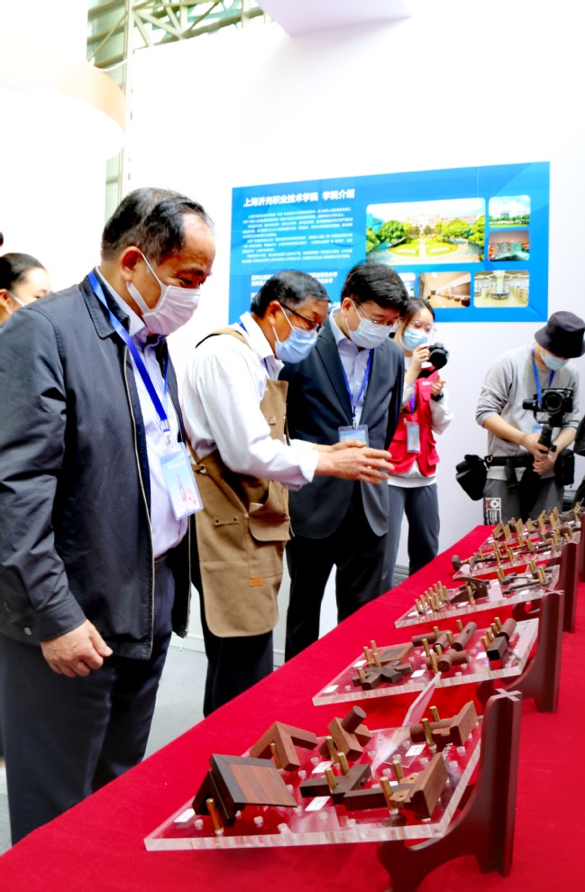 上午9时15分左右,上海市副市长陈群来到我院职业体验项目展位亲切看望参展人员。李永盛院长向陈副市长介绍了我院木工大师工作室的创建、运行及职教融合以及济光学院职业体验展位的相关情况。陈群副市长饶有兴致地观摩了木工大师工作室负责人、上海工匠顾惠明大师展示的古建筑结构榫卯节点、微缩木工手工工具、经典榫卯十二式等作品,在微缩水车和微缩缝纫机前,伴随着电动马达的驱动,水车和缝纫机飞速运转,现场响起一片称赞。
