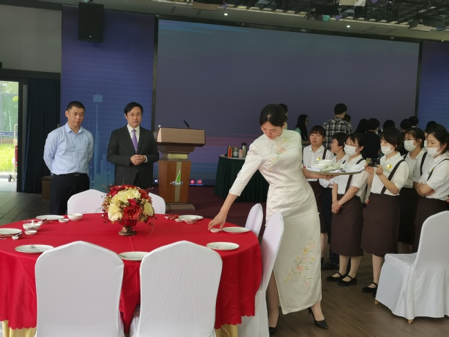 在技能展示环节中,韩鑫鑫和龚妙妍两位同学分别进行了中餐主题宴会和西餐零点的餐台布置技能展示;随后在来自上海宝隆宾馆的企业专业主任史明园老师的指导下,分别展示了茶艺和鸡尾酒调制技术。专业群师生精彩娴熟的技能展示得到了东方绿舟酒店领导和员工们的称赞。