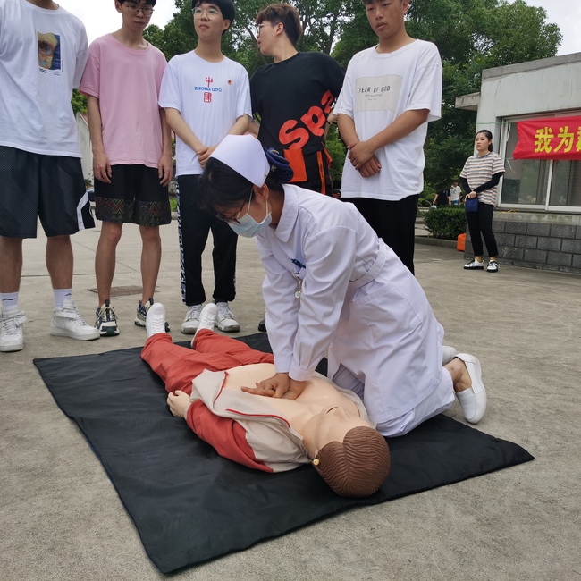 我院红十字会的优秀护理学子在老师的专业指导下,向大家示范了心肺复苏的操作流程,并讲解了如何规范操作,包括判断患者意识、有无自主呼吸、如何胸外按压及人工呼吸等专业急救知识。