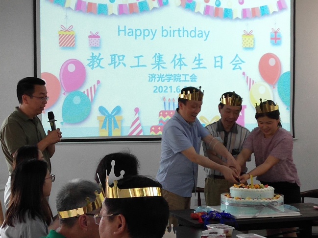工会主席王云飞代表学院领导向参加活动的教职工致以集体生日的祝贺。大家围坐在桌旁,分享着生日蛋糕和水果,老中青三代点燃了生日蛋糕的蜡烛,大家一起唱起生日之歌,为参加活动的教职工送上生日礼物和最美好的祝福!与会教职工分别谈了自己的感想和体会,大家深深感受到,学院工会为教职工提供了这么好平台,让我们彼此相识相知,我们愿为济光学院的发展做出贡献,并记住这个快乐和充满温情的集体生日会。