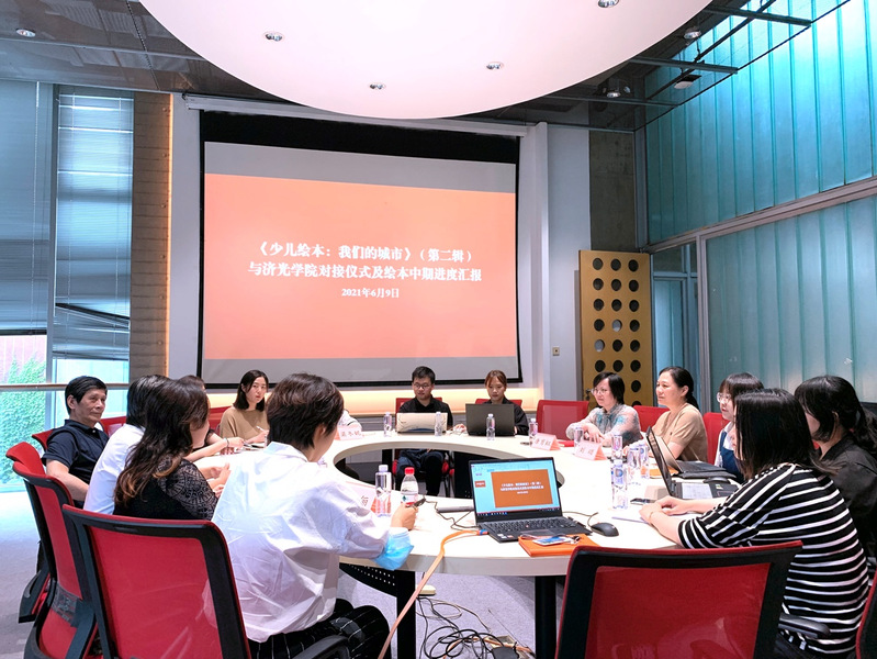 刘颂书记感谢济光艺术设计系为同济大学带来的建党百年文献展,也欢迎济光艺术设计系加盟城市绘本的创作工作,并对城市绘本的质量提升充满着期待,希望双方今后不仅是城市绘本的项目,还可以在更广泛的学术领域展开合作交流,建筑城规学院就像是艺术设计系的家,欢迎各位老师随时回家。刘颂书记、唐育虹副书记还向参会的济光老师赠送了第一辑城市绘本。紧接着建筑城规学院城市绘本第二辑的各组学生团队将近阶段绘本创作工作进行了汇报,济光艺术设计系教师团队针对各组学生的汇报给予了点评、指导和互动讨论。
