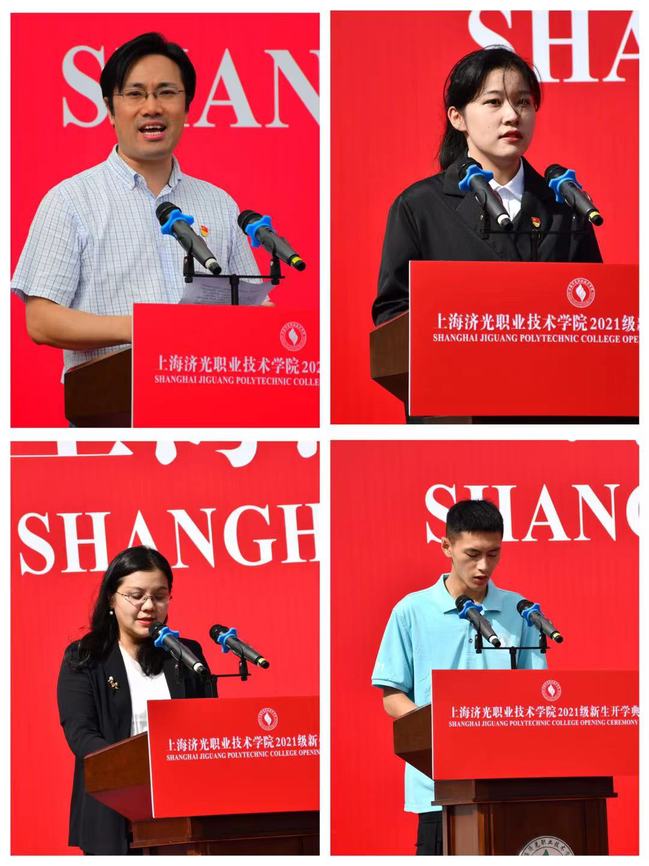 教师代表、经管系副系主任林俊寄语大一新生努力学习丰富的专业知识,锻炼扎实的技术技能,磨练坚强的意志品质;老生代表、2019级护理专业张珂瑞向新生分享了自己的感悟;校友代表、上海友旗建筑装饰公司创始人、2009届毕业生陈晓英介绍了自己在母校的求学经历、毕业离校后的奋斗历程,以及对母校的感恩、对新生的祝福;新生代表、2021级建筑工程技术专业盛荣祺分享了自己从一名退伍军人到济光新生的青春故事,表达了新生对未来大学学习和生活的希冀。