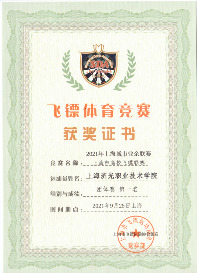 2021年9月25日,由基础部体育教研室孟凡涛老师带领飞镖队参加了在上海飞镖运动协会举行的上海市高校飞镖联赛(2021赛季)。经过激烈角逐,我院全体队员全力以赴,取得优异成绩,斩获上海市高校飞镖联赛(2021赛季)团体赛第一名。