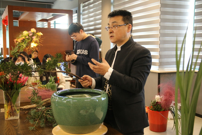 徐国栋老师是上海非物质文化遗产“海派插花”传承人,担任中国插花花艺协会理事,国家人才储备委员会高级园艺师,美国芝加哥花艺学院教授,上海市插花花艺协会常务理事、副秘书长,上海市插花花艺协会市北分会会长,上海市插花花艺研究会副主任委员等,其作品多次荣获国际及中国花艺设计大赛金奖。揭牌仪式后,徐老师做了《中国传统插花艺术与花艺技能大赛》专题讲座,深入讲解了海派插花艺术的渊源、特色及哲学内涵,介绍了各级别技能大赛的情况。他还与花艺技能大赛获奖学生合作进行现场表演,并与在场师生交流与互动。徐国栋老师的精湛技艺赢得了师生的惊叹与好评。