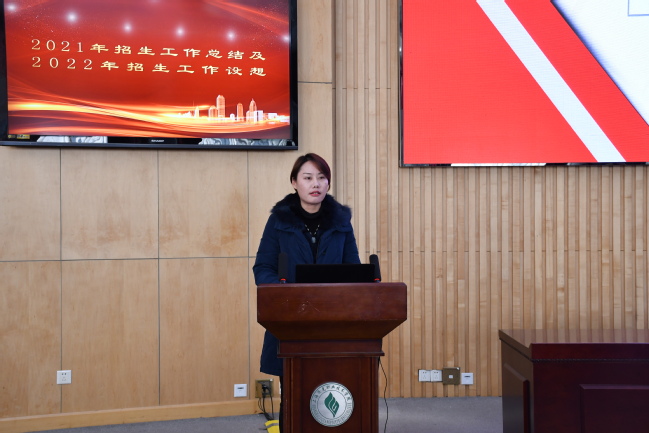 招生办副主任朱敏华作了《认清形势 明确目标 统一思想 砥砺前行》为主题的招生汇报。2021年,我院积极应对新高考改革以及复杂多变的招生严峻形势,全院上下齐心协力,圆满完成各阶段招生工作任务。2022年将继续深入学习职教改革文件,扎实推进招生工作,要优化专业调整布局,加强专业内涵建设;落实精准招生宣传,注重招生宣传策略;研究新高考综合改革招生规律,服务考生升学,举全院之力,为实现新一年度招生目标而持续发力。