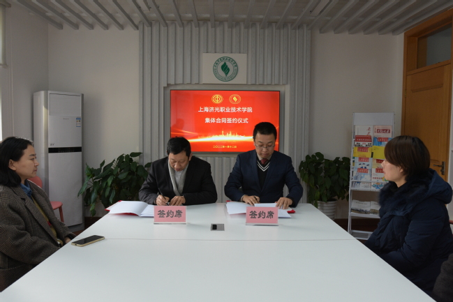 四届二次双代会闭幕后,学校行政方首席代表校长胡展飞和学校职工方首席代表工会主席王云飞签署了《上海济光职业技术学院集体合同》。