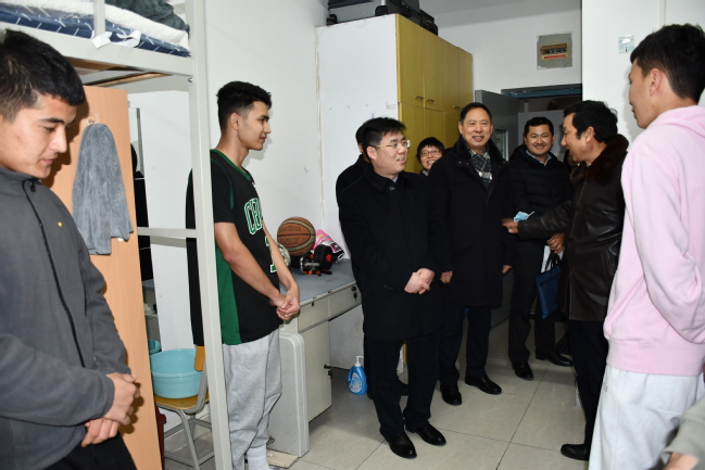 调研会后胡章萍组长率队对学校校门、食堂、防疫仓库、学生宿舍、实训室等重点部位进行了实地检查。