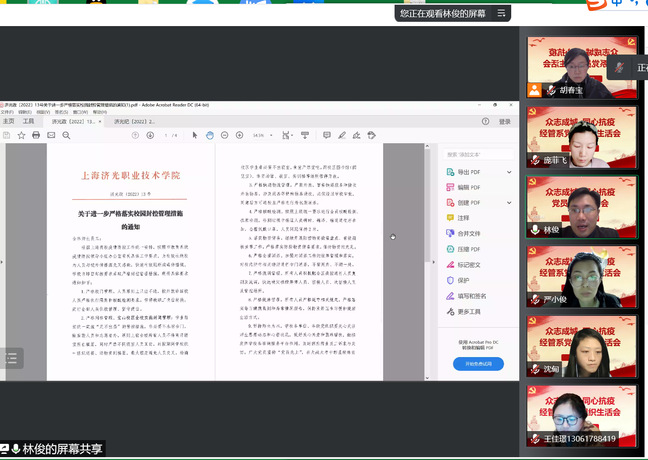 面对严峻的疫情防控形势,党员同志们用实实在在的行动既展现了舍小家为大家,坚守防控一线,无怨无悔、细致入微服务师生的自我奉献精神;也展现了居家隔离,积极参与社区防疫志愿服务,主动亮身份、争表率、见行动、作贡献的使命担当精神。我们坚定“坚持就是胜利,坚持才能胜利”的防疫信念,提高站位、不存侥幸心理、不敢掉以轻心、不能麻痹懈怠,为全市打赢疫情防控这场大仗硬仗贡献力量。特殊时期的在线组织生活,凝聚起全体党员同志众志成城、共克时艰的强大合力,大家一致表示,必将同心抗疫,坚决打赢疫情防控阻击战。 “众志成城,同心抗疫”只要我们万众一心,一定能在这场抗疫阻击战中取得最后的胜利!