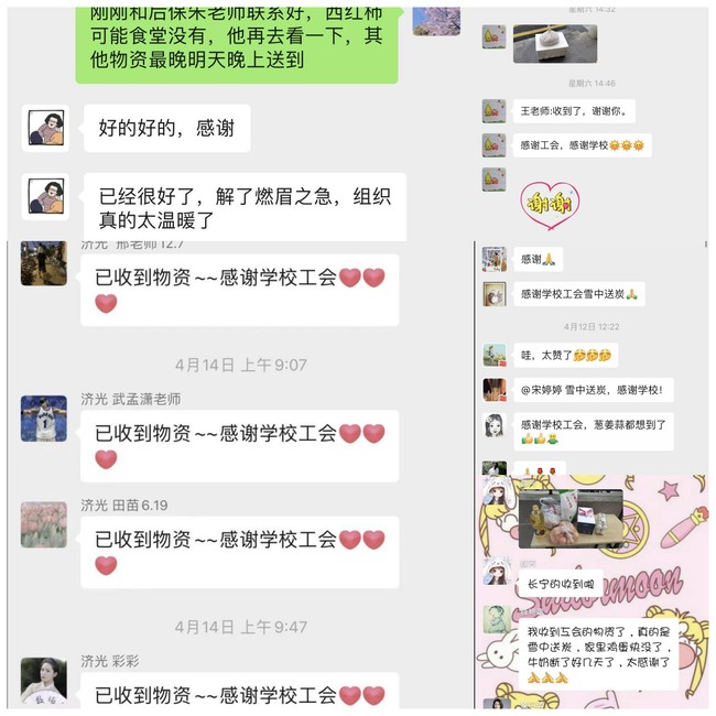 近日,校工会得知有三位老师因居住小区无法团购,生活物资极度紧缺的情况后,紧急与后保处联系,迅速将生活物资派专车送往老师家中,以解燃眉之急。