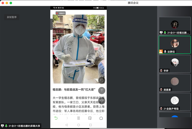 思政部积极落实学校党委学习部署,在思政部青年教师赵静茹的思政课堂上,特别邀请檀志鹏同学通过雨课堂平台嵌入的腾讯会议,给大家分享他参与上海市防疫抗疫志愿者活动的经历与心得。作为退役军人,檀志鹏同学在学校担任班级的组织委员,配合辅导员做好班级活动组织工作,疫情发生后,他积极响应上海市退役军人事务局紧急征召,奔赴疫情防控一线。在思政课堂上,他讲述了自己在合德食品有限公司、张庙街道泗塘一村的抗疫前线从事志愿服务工作的经历,展示了退伍军人挺身而出、勇挑重担的责任与担当,诠释了“退役不褪色”的铮铮誓言。同学们听了檀志鹏的分享后,深刻体会到了“哪有什么岁月静好,只是因为有人在负重前行”这句话的分量,坚定了抗疫必胜的信心,同时深受鼓舞和教育,同学们纷纷表示一定要遵守学校防疫抗疫规定,为打好疫情防空阻击战奉献青春力量。