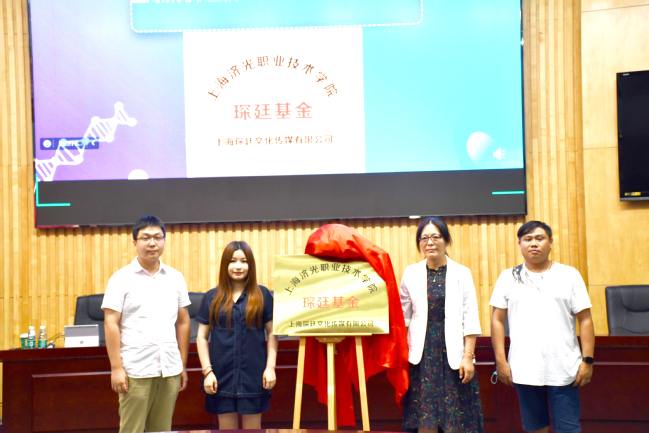 现场,蒲雯婷女士隆重宣布上海济光职业技术学院“琛廷基金”成立,经管系主任张迺英教授及电子商务专业主任盛朱勇、琛廷传媒董事长浦雯婷,总经理王玮共同为基金揭牌。