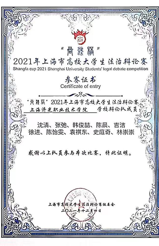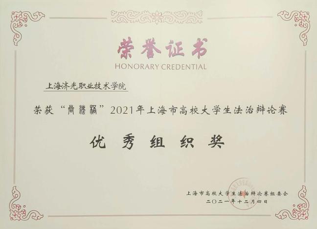 为庆祝中国共产党建党百年华诞,深入贯彻习近平新时代中国特色社会主义思想和党的十九大精神,全面推进依法治国,积极培育和践行社会主义核心价值观,倡导当代大学生“学史明志,知史爱国”,提高大学生的法治意识与道德素养,我校团委组织法治兴趣社成员积极参加“尚法杯”2021年上海市大学生法治辩论赛,获得“优秀组织奖”。