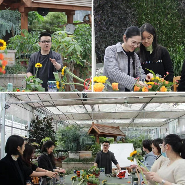 “名师工作室”海派插花非遗传承人徐国栋老师介绍了本次花艺作品的创意及所用花材,他指导师生用代表忠诚、希望的向日葵作为主花,选用辉煌玫瑰、多头玫瑰、红豆等多种植物材料,进行创意及造型,表达对祖国母亲的热爱与祝愿。徐国栋老师用讲解和亲自示范指导大家进行创作,师生们纷纷动手实践,按照特定陈设空间,创作个性化的花艺作品,创作过程中,师生们积极交流与互动,花艺活动现场气氛热烈。