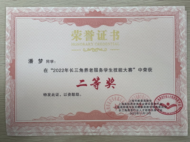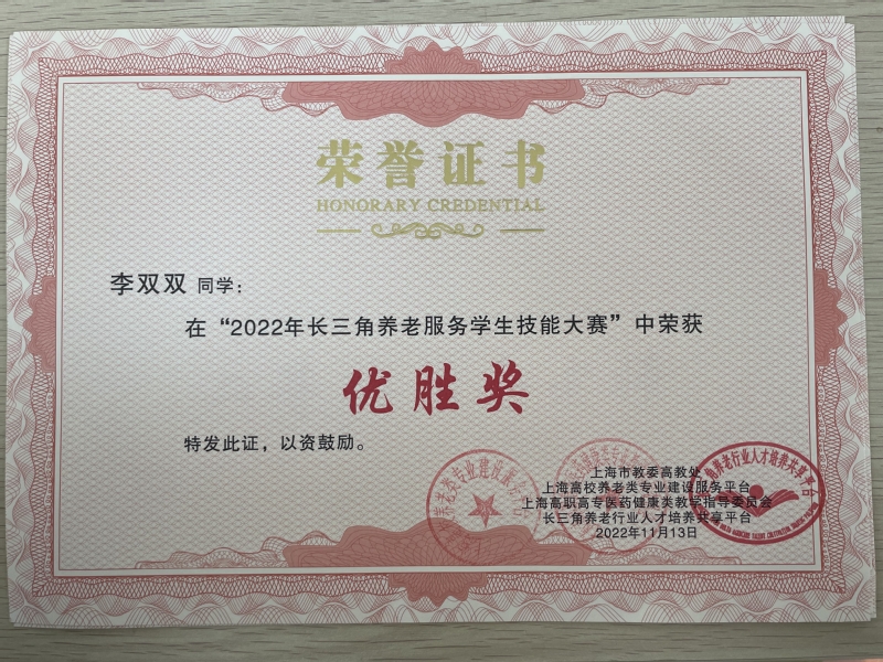 11月10日至13日,2022年长三角养老服务技能“育-训-赛”一体化活动在上海开展。该活动由上海市教委职教处指导,上海高校养老类专业建设服务平台、上海高职高专医药健康类教学指导委员会、长三角养老行业人才培养平台主办,上海开放大学和上海城建职业学院承办,由11所长三角地区高校指导老师和21名选手参加。我校20级护理专业学生潘梦、李双双在张倩、朱静教师及护理学院教师指导团队的专业指导下,以扎实的知识功底和娴熟的操作技能荣获个人二等奖和优胜奖的好成绩。