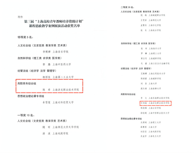 笔尖耕耘桃李地,墨水浇开智慧花。第三届“上海高校青年教师培养资助计划项目”课程思政教学案例展演顺利落下帷幕,经市级展演、专家评审、组委会审定,我校学前教育学院陈希老师荣获特等奖,建筑工程学院方圳海老师荣获二等奖,这是我校第二次在“上海高校青年教师培养资助计划”课程思政教学案例展演中斩获佳绩。