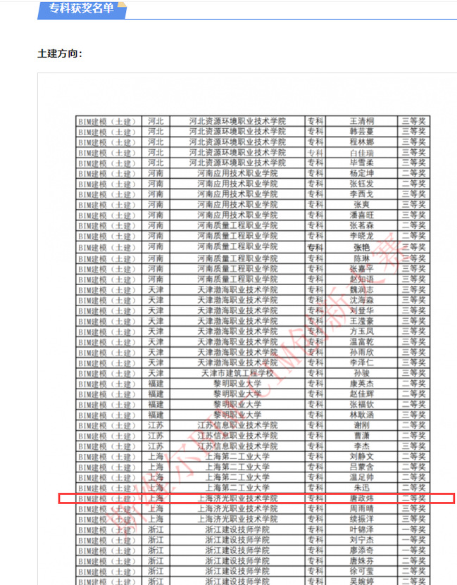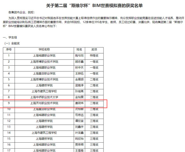 建筑工程学院2020级智能化工程技术专业1班唐政炜同学在2022~2023第一学期顶岗实习期间,积极参加学校方以及实习单位方的比赛,参与多个赛项,在实习单位中森建筑与工程设计顾问有限公司企业带教老师王思凡与学校实习带教老师俞嘉的指导下最终获得了多个奖项,获奖情况如下:第二届“斯维尔杯” BIM世赛模拟赛 二等奖第十四届斯维尔杯-BIM建模(个人赛)-土建 二等奖最强“智”造大师全国施工设计大赛高校组 二等奖第三届张江国信安杯职业组 三等奖