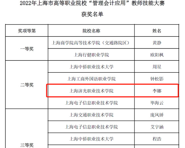 2022年12月23日,在上海市高职高专经济类专业教学指导委员会主办的上海市高等职业院校“管理会计应用”教师技能大赛中,我校经济管理学院李娜老师喜获二等奖。