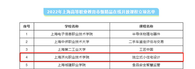 根据《上海市教育委员会关于做好2022年度上海高等职业教育市级精品在线开放课程申报工作的通知》精神,上海市教育委员会组织了2022年度上海高职高专院校市级精品在线开放课程遴选。近期,评审结果公布,全市共有39门课程获得立项建设,我校黄琪老师团队(黄琪、宋雯珺、王云霞、胡骁杰、刘伊丹、林大卫、柏梦杰)建设的独立式小住宅设计获得立项。