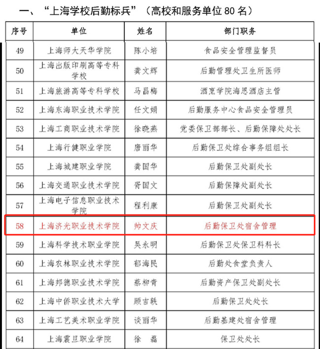 此次我校推荐了帅文庆参与了本次的“上海学校后勤标兵”(绿叶奖)的评选活动,凭借着出众的工作能力与认真踏实的工作态度获此殊荣。